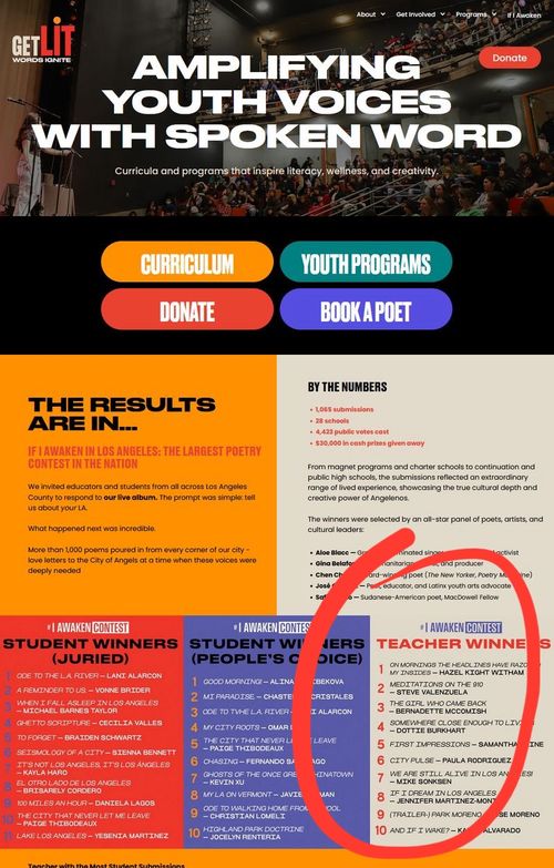 The competition was organized by Get Lit Words Ignite for students and teachers in Los Angeles County. They organized and performed a musical & spoken word album about the city. Poems were written, performed, recorded, and shared. Those poems were then at the heart of the poetry competition. Students were encouraged to participate, and very surprisingly, teachers too! Ten students were selected to win prizes. And ten teachers too!