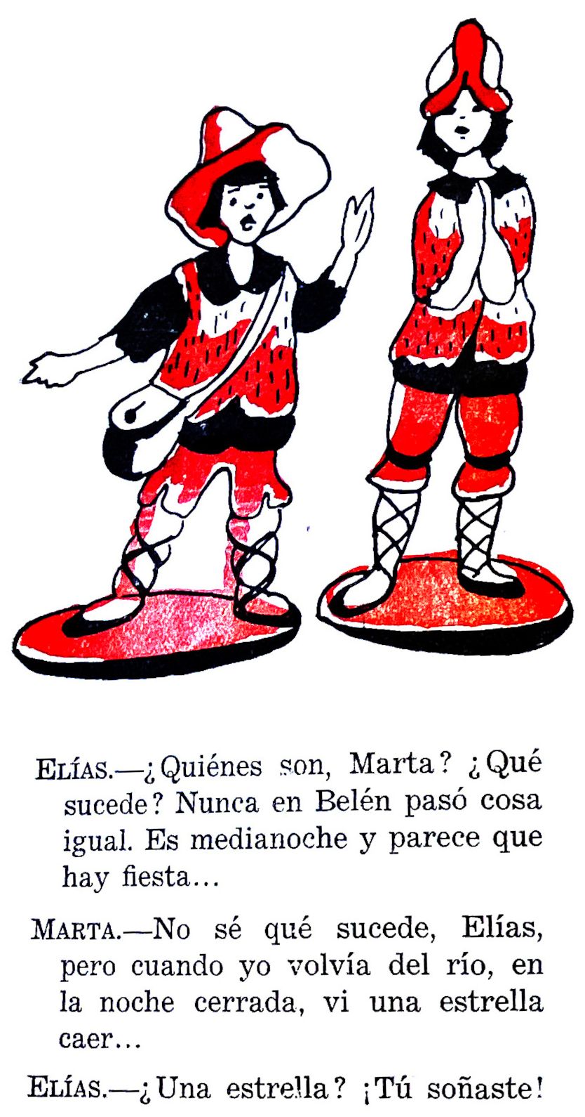 Marta (12), Elías (10, a young basket-maker who can’t walk), three angels, and a group of shepherds (Antón, Beltrán, Ana, Tomás . . . ).